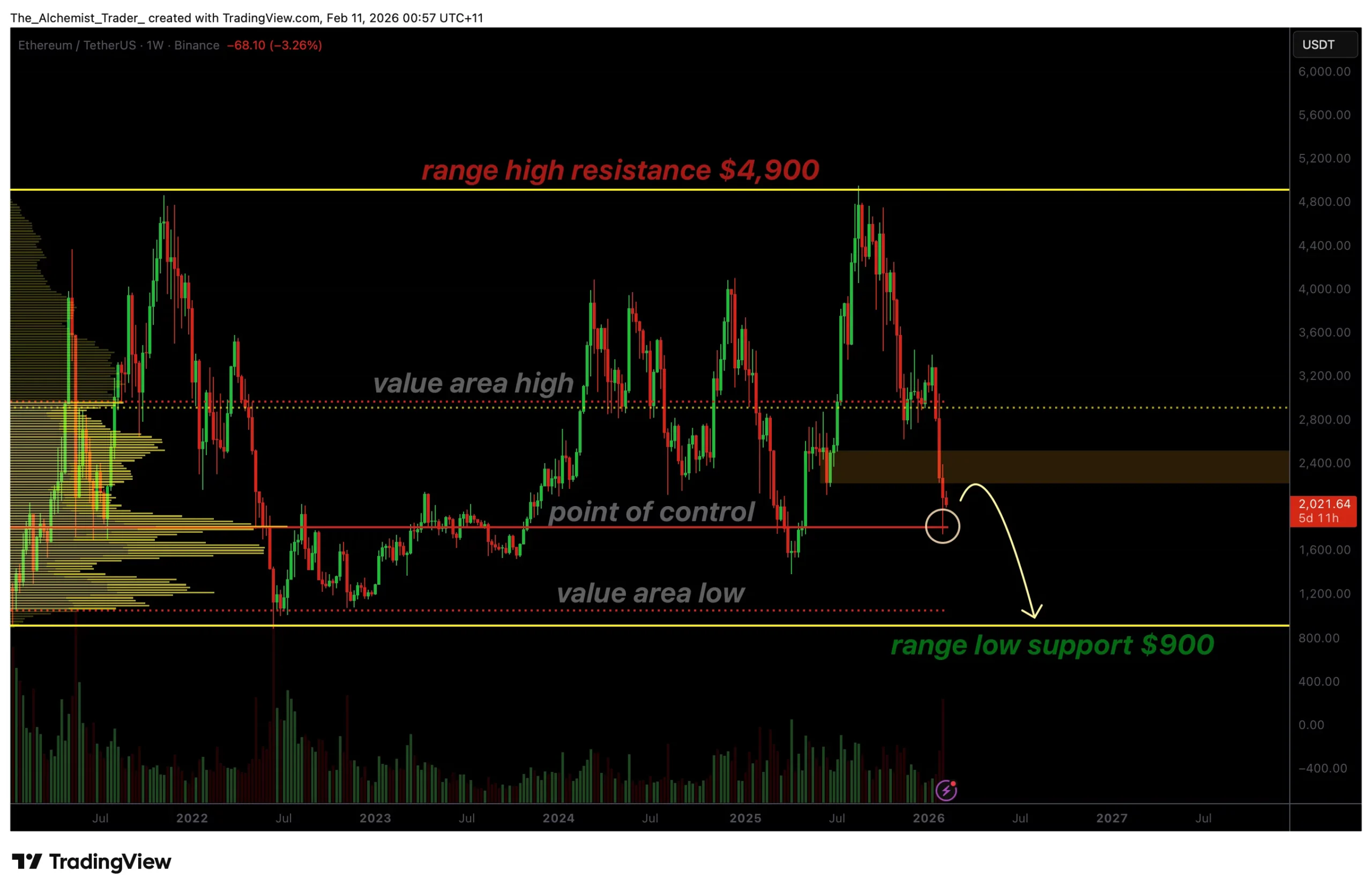 From a high-timeframe perspective, the next major downside target sits near the $900 level. This zone aligns with the value area low and the lower boundary of Ethereum’s broader trading range. Previous interactions with this region have resulted in strong reactions, making it a critical area for potential stabilization or reversal.